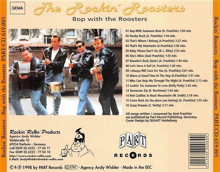 Das Album der Authentic-Rockabillys aus Berlin auf PART.Das Quartett um Sänger und Kontrabassist AXEL PRAEFCKE, der bis heute als Musiker und Komponist aktiv ist und u.a. für Szenegrößen wie IKE & THE CAPERS, ROUND UP BOYS, SPO-DEE-O-DEE oderCHERRY CASINO & THE GAMBLERS schrieb und spielte, existierte von 1992-1997. Die Band präsentierte auf Bop With The Roosters ihren Sun-Studio-beeinflussten Roots-Rockabilly, der mit dezenten Hillbilly- oder Westernswing-Einsprengseln abgerundet wurde. Fast alle der 16 wunderbar groovigen und stilvollen Songs wurden von PRAEFCKE selbst geschrieben. Eine erstklassige Rockabilly-Band, die bis heute viele Szenekenner begeistert.