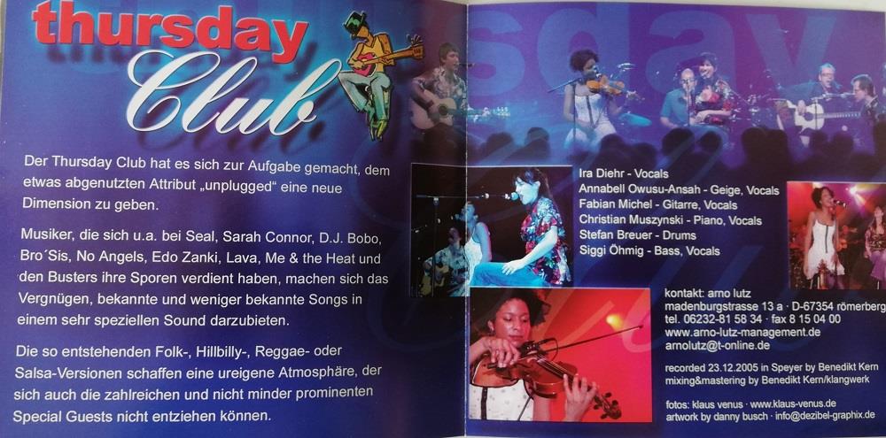 Der Thursday Club bestand aus gestandenen Musikern aus Süddeutschland und spielt unplugged. Folk, Hillbilly, Reggae oder Salsa-Versionen bekannter Hits.